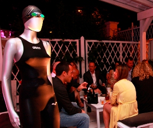 Al piano terra, come in una vera reception d’albergo, gli ospiti hanno ritirato una tessera magnetica che ha dato loro la possibilità di usufruire dei servizi dell’hotel, disponibili presso le numerose aree di intrattenimento allestite negli spazi dell’Invillà: piano bar e area massaggi al primo piano, casinò al secondo, vip lounge, buffet e dj set nel giardino. Qui, a bordo piscina, modelli e modelle con indosso i costumi Gazzetta dello Sport by Arena hanno animato la serata, permettendo agli ospiti di vedere in anteprima la nuova collezione.